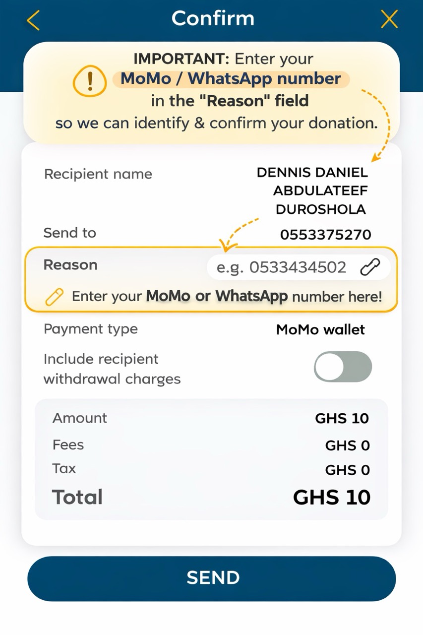 IMPORTANT: Enter your MoMo or WhatsApp number in the “Reason” field so we can identify and confirm your donation.